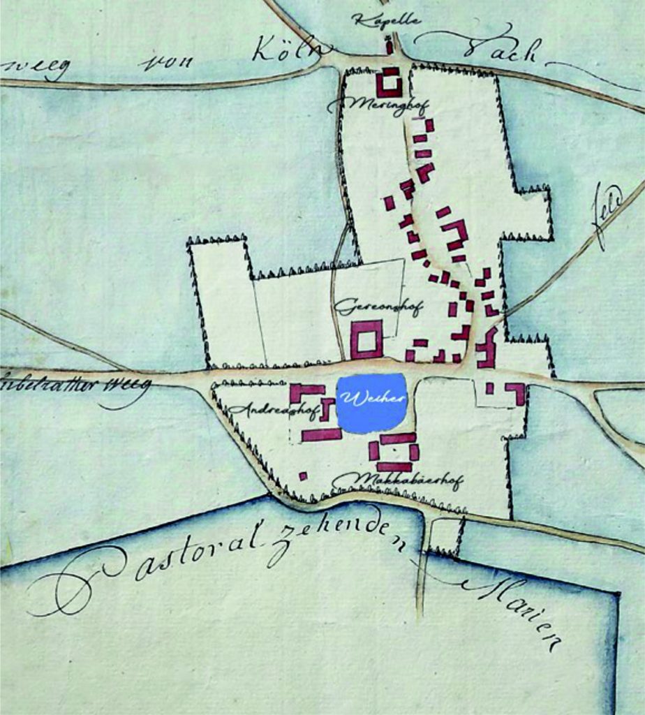 Auf der „Carte über den Bickendorffer Zehenden“ von 1792 erkennt man den Ursprung des heutigen Gebäudekonglomerates.