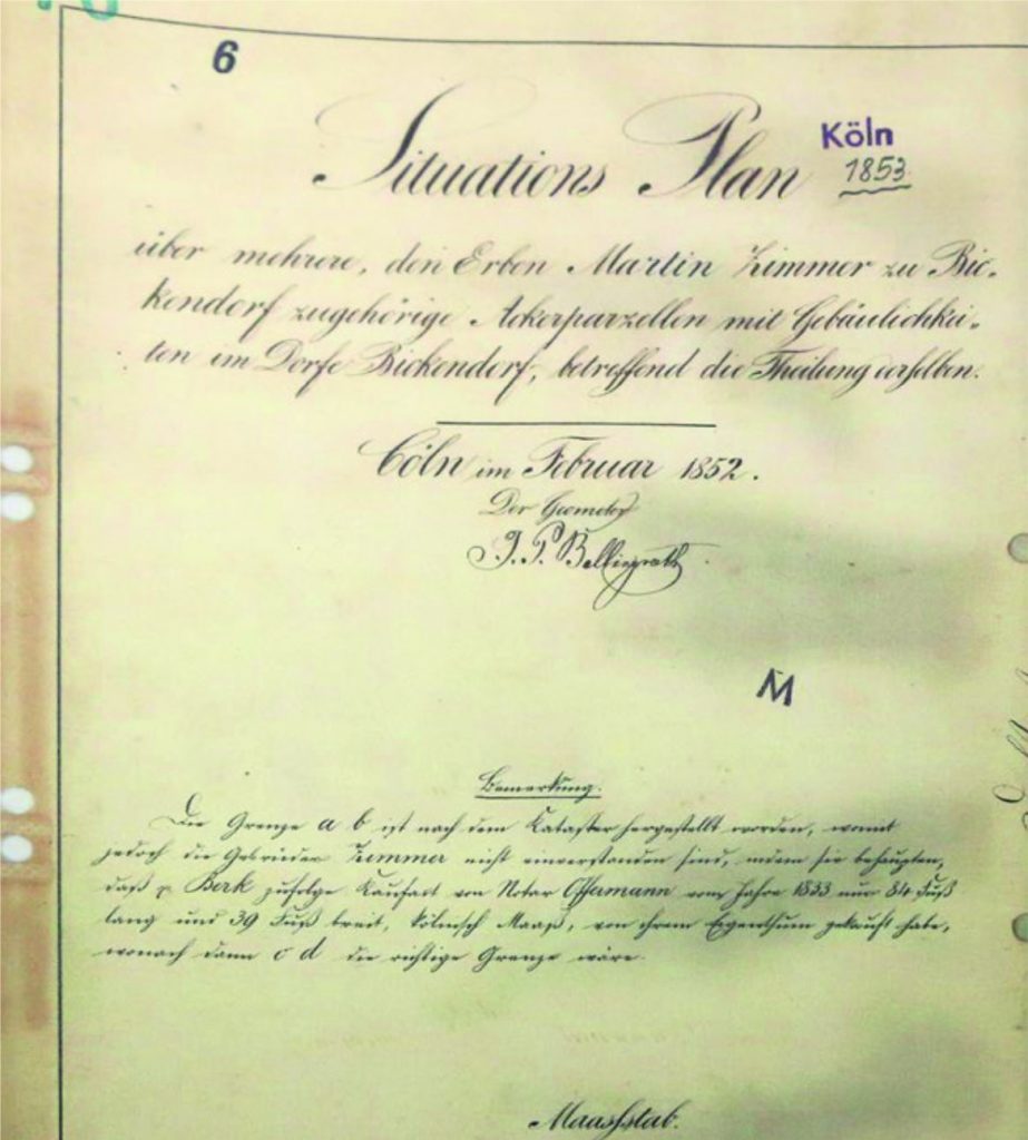 Über mehrere, den Erben Martin Zimmer zu Bickendorf zugehörige Ackerparzellen mit Gebäudlichkeiten im Dorfe Bickendorf, betreffend die Teilung derselben.