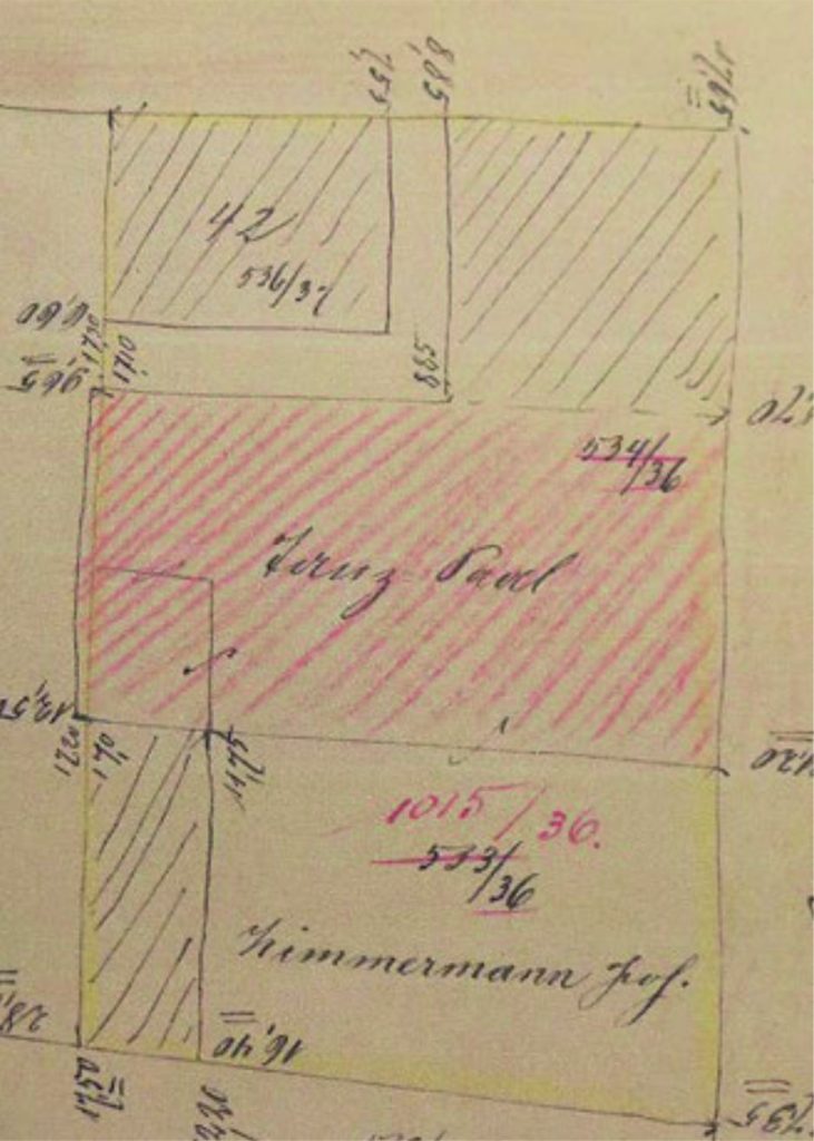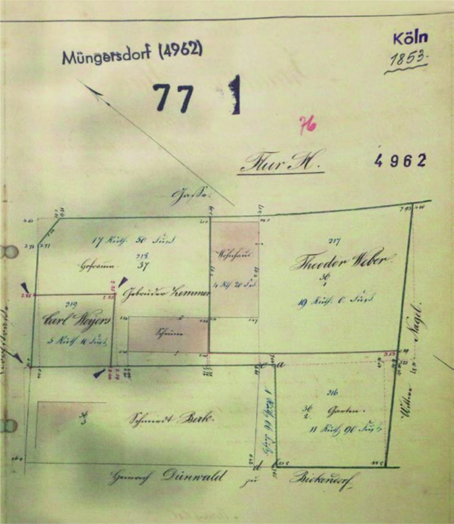 Die Grenze a b ist nach dem Kataster hergestellt worden, womit jedoch die Gebrüder Zimmer nicht einverstanden sind, indem sie behaupten, dass Berk zufolge Kaufakt von Notar Offermann vom Jahre 1833 nur 84 Fuß lang und 39 Fuß breit, kölnisches Maaß, von ihrem Eigentum gekauft habe, wonach dann c d die richtige Grenze wäre.