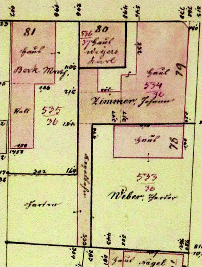 Nach dem Tode Martin Zimmers wurden dessen Besitztümer vererbt. Seine älteste Tochter Gertrud (1817 – 1859) und ihr Ehemann Theodor Weber erbten das kleine Wohnhaus. Zu dieser Zeit war es üblich, dass die Hauserben gemeinsam mit der verwitweten Mutter das Haus bewohnten. Die restlichen Ackerparzellen und die kleine Scheune erbten Martin Zimmers Söhne, die Gebrüder Josef, Peter und Johann Zimmer. Das Grundstück, auf welchem heute das Haus Rochusstraße 60 steht, war schon 1833 von Martin Zimmer an einen Schmied namens Berk verkauft worden. Der „Situationsplan von 1852“ ist aufgrund von Grenzauseinandersetzungen mit Herrn Berk angefertigt worden.