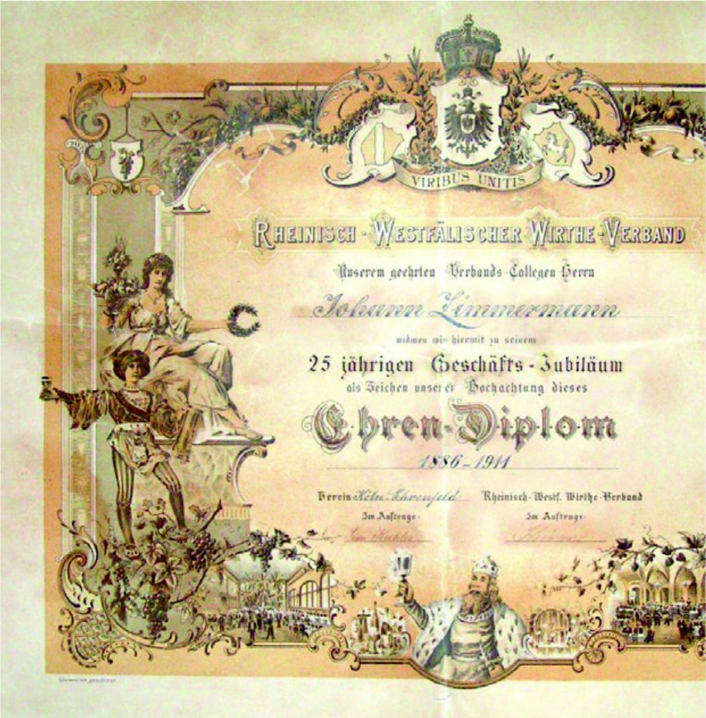 Im Jahr 1901 wurde Johann Zimmermann zum 25jährigen Betriebsjubiläum mit einem Ehrendiplom des „Rheinisch-Westfälischen Wirthe-Verband“ geehrt.