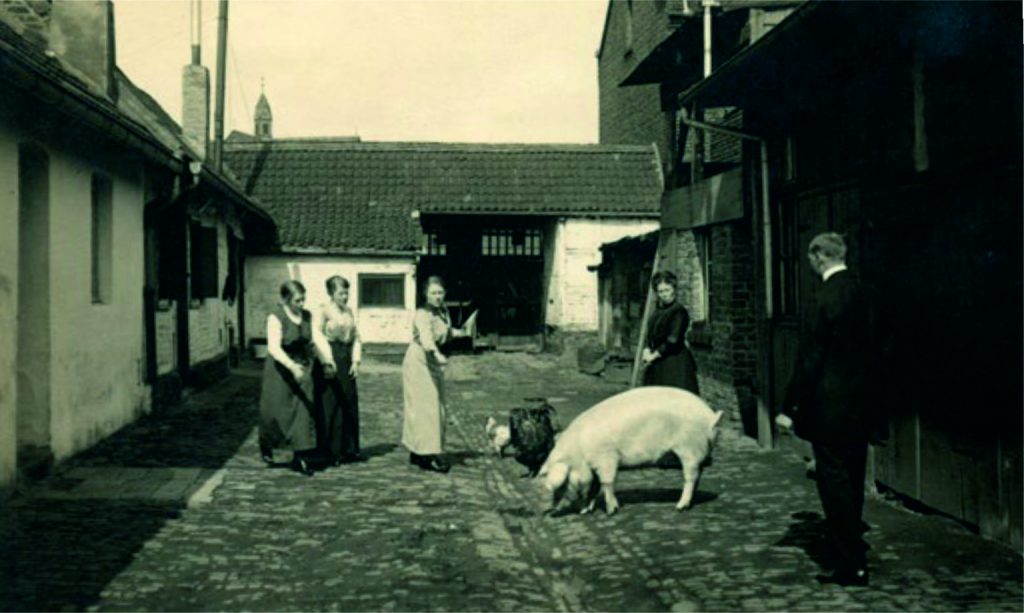 Dornhof innen mit Ottilie Still (Stiell), Sohn Johann, 3 Töchtern und Schwein Gottfried